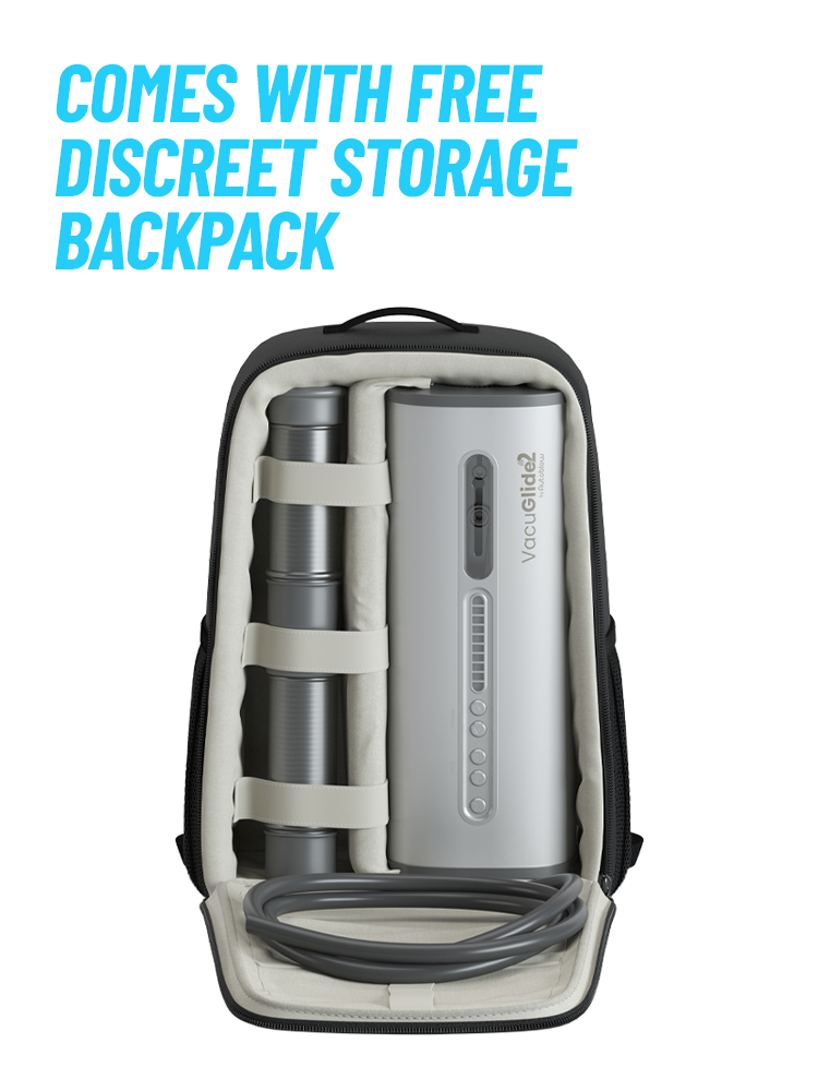 Because we know that discreet storage is important to VacuGlide owners, every VacuGlide comes packed inside of a black backpack with a dedicated space for each component.